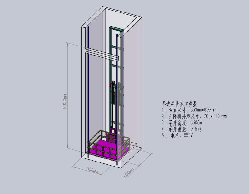 优点:单边导轨升降机外观简洁,能使用小范围升降,更能符合小空间的升降;